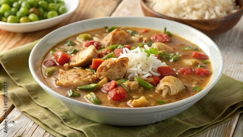 Delicious chicken gumbo served in a bowl with rice and vegetables on a rustic wooden table decorated with greenery
