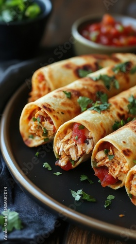 Delicious chicken taquitos with fresh salsa and cilantro garnish for mexican cuisine lovers