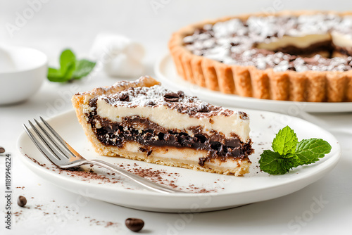 Delicious Chocolate and Cream Layer Pie Slice with Mint Leaves on White Plate, Ideal for Bakery, Pastry, and Sweet Dessert Photography Themes
