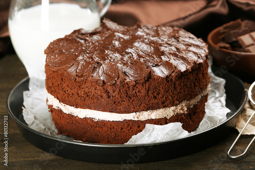 Delicious chocolate cake on table on brown background