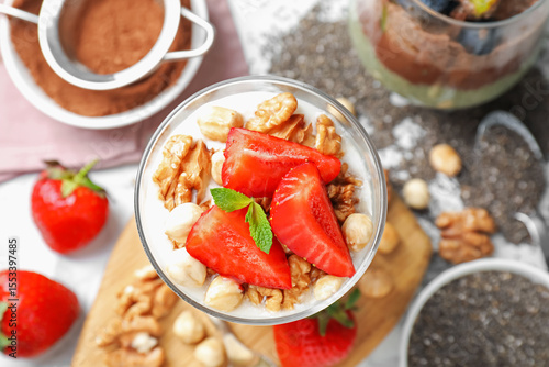 Delicious chocolate pudding with chia seeds, strawberries, yogurt and nuts in glass on white table, flat lay