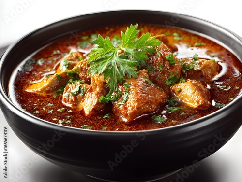 Delicious chunks of meat simmered in a flavorful and aromatic brown sauce, garnished with fresh parsley sprigs.