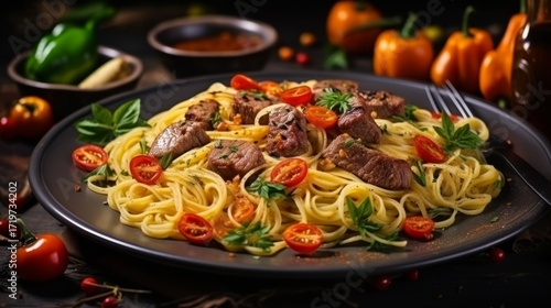 Delicious Classic Italian Spaghetti Plate with Flavorful Steak, Fresh Tomatoes, and Elegant Spices