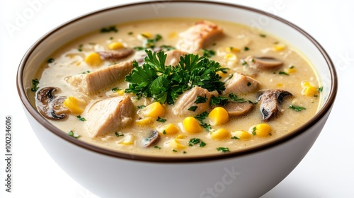 Delicious Creamy Chicken Corn Soup Garnished With Fresh Herbs in a Serene Kitchen Setting
