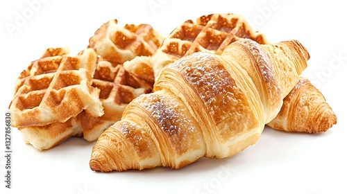 Delicious Croissants and Waffles Isolated on White Background