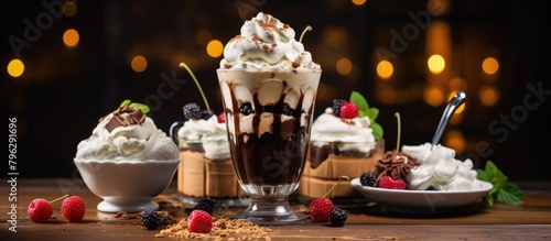 Delicious dessert topped with whipped cream, chocolate, and fresh berries
