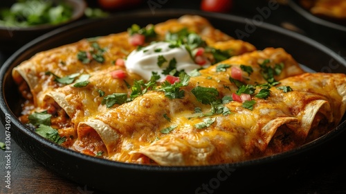 delicious enchiladas topped with cheese sour cream and fresh cilantro