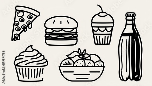 Delicious Food and Drink Icons Pizza Burger Cupcakes Fruit Salad Soda