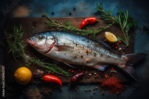 Delicious fresh fish on dark vintage background. Fish with aromatic herbs, spices and vegetables - healthy food, diet or cooking concept