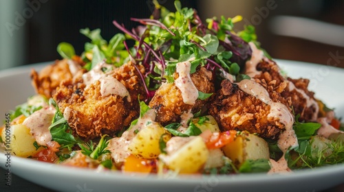 Delicious Fried Chicken and Potato Salad Dish with Fresh Greens and Dressing on Ad Poster