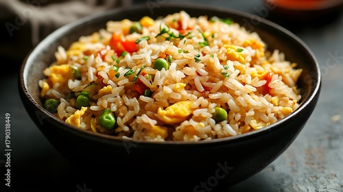 Delicious fried rice with fluffy egg and fresh vegetables served in black bowl, perfect for takeout menus, meal kits, or home cooking inspiration