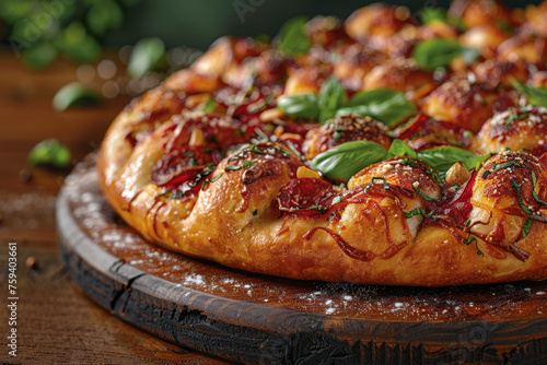 Delicious Garlic Knot Crust Pizza Close-Up on Wooden Tray Gen AI