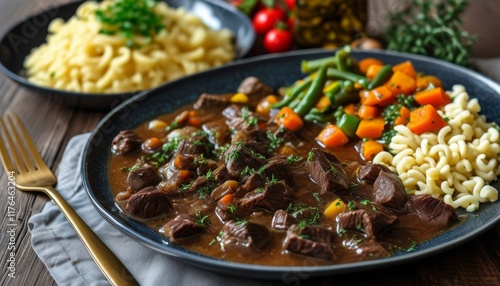 Delicious German Beef Goulash Served with Vegetables and Pasta on a Rustic Table