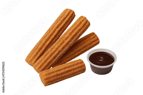 Delicious golden brown churros with chocolate dip isolated on a transparent background