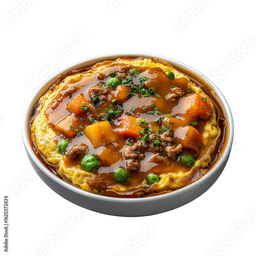 Delicious home-cooked omelet with savory sauce and vegetables cozy kitchen food photography warm ambiance top view culinary delight