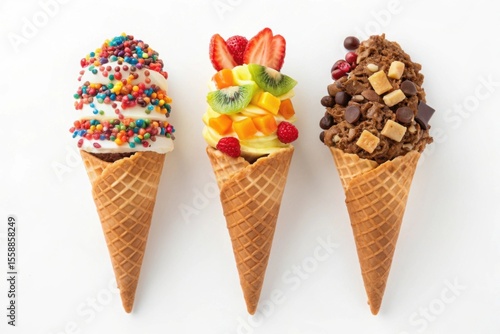 Delicious Ice Cream Cones with Toppings and Fresh Fruits Display