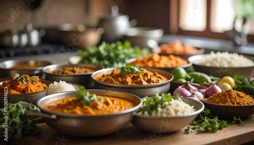 Delicious Indian Cuisine Aromatic Curries Rice and Spices in Rustic Setting