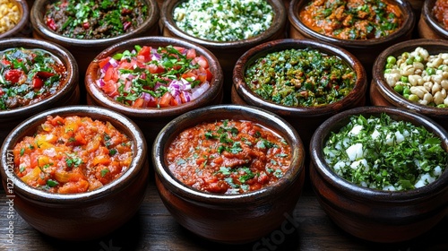 Delicious Indian Cuisine: Colorful Dishes in Traditional Bowls on Wood