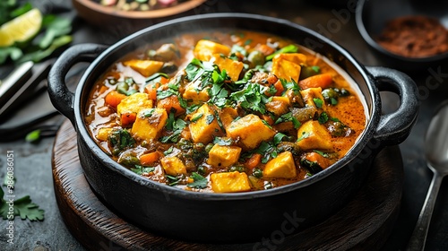 Delicious Indian paneer curry with vegetables and spices in a black pan.