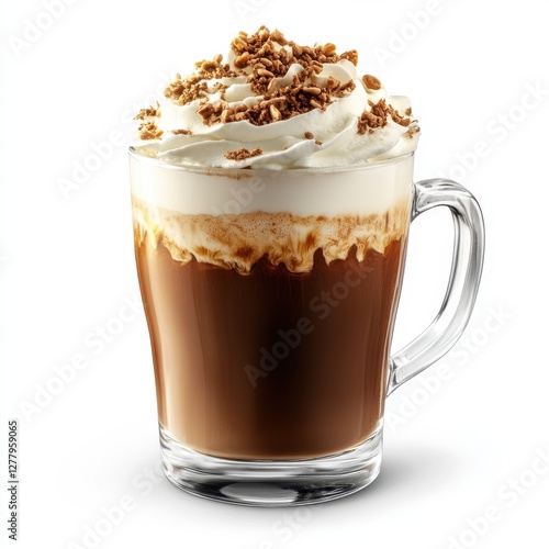 Delicious Irish coffee in a glass with whipped cream and chocolate chips on a white background studio shot