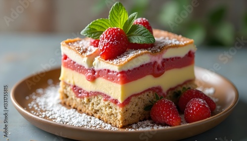 Delicious layered cake with strawberries and mint garnish.