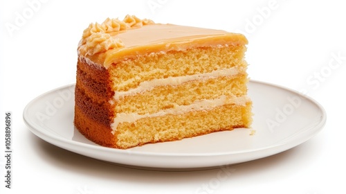 Delicious layered caramel cake slice on white plate - close-up dessert photography