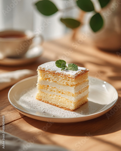 Delicious layered cream cake on white plate. Soft natural light creates tempting dessert