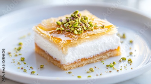 Delicious layered pastry with whipped cream and pistachios, ideal for dessert advertising, restaurant menus, and culinary photography