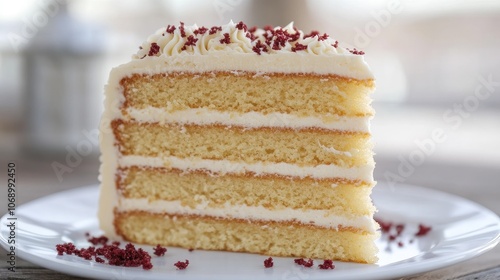 Delicious Layered Vanilla Cake Slice with White Frosting and Red Velvet Crumbs on Plate