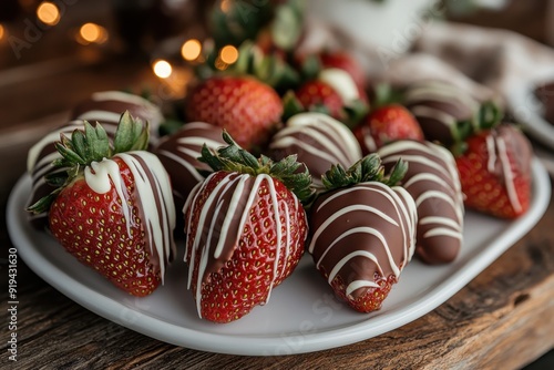 Delicious, lush strawberries dipped in dark chocolate and artistically drizzled with white chocolate, placed on a ceramic plate, representing gourmet dessert artistry.