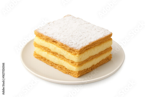 Delicious mille-feuille pastry dusted with powdered sugar, sitting on a white plate, with a transparent background for easy integration into food projects