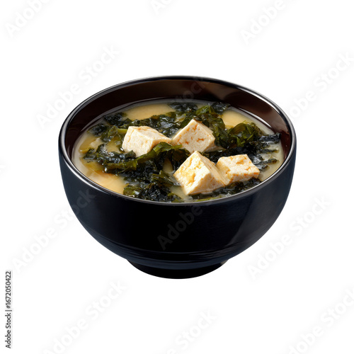 Delicious Miso Soup with Tofu and Seaweed in a Black Bowl