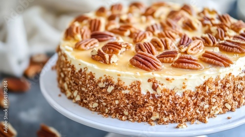Delicious Pecan Caramel Layer Cake with Crunchy Nuts on Top