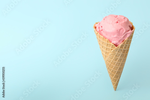 Delicious pink ice cream in waffle cone on light blue background. Space for text