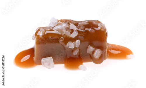 Delicious salted caramel with sauce on white background