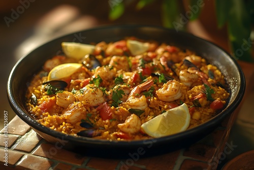 Delicious seafood paella in a wide pan garnished with fresh lemon and herbs
