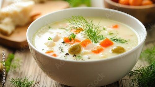 Delicious Seafood Soup with Fennel Paprika Olives and Vegetables Served in a Warm Bowl on Wooden Table