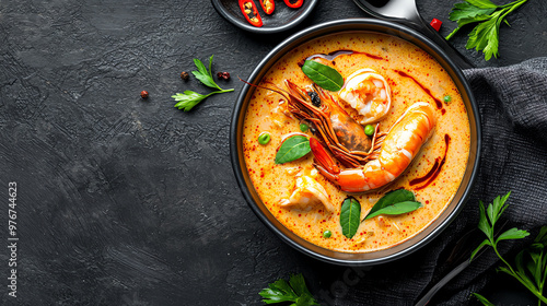 Delicious shrimp soup served in a dark bowl with fresh herbs, spices, and a rich, flavorful broth. Perfect for seafood lovers.