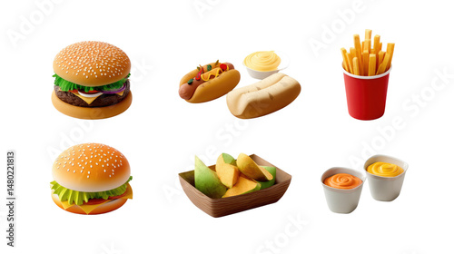 Delicious Snack Arrangement: A mouthwatering assortment of fast food delights, featuring a juicy burger, hot dogs, crispy fries, and other tasty treats. perfect for a satisfying meal or snack.