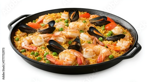 Delicious Spanish Paella Seafood Dish in a Cast Iron Pan