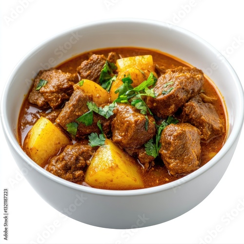 Delicious Spicy Beef Curry with Potatoes Garnished in a White Bowl