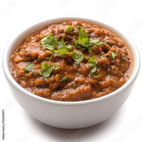 Delicious Spicy Eggplant Curry Garnished With Fresh Cilantro in a White Bowl