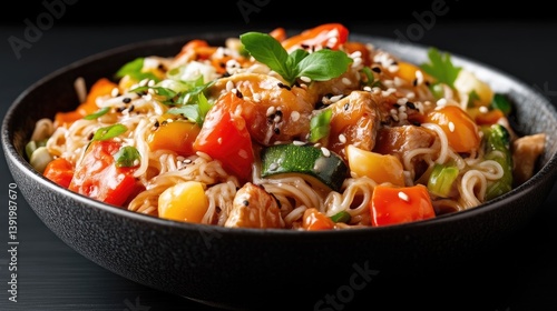 Delicious stir-fried noodles with pork and vegetables. A vibrant medley of colorful bell peppers, zucchini, and sweet fruit, all tossed with tender pork and delicate noodles.