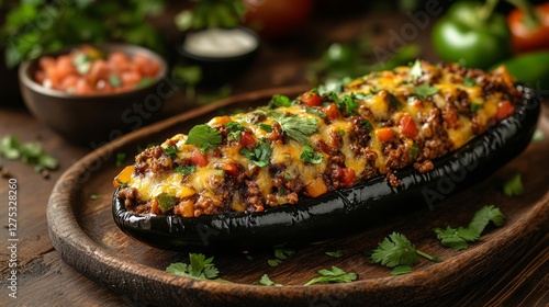 Delicious Stuffed Eggplant with Ground Meat and Cheddar Cheese. Generative AI