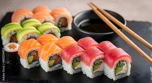 Delicious Sushi Rolls Assortment with Chopsticks and Soy Sauce
