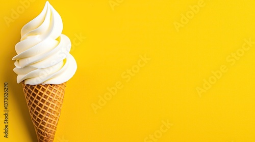 Delicious swirl of soft serve ice cream served on crisp waffle cone against vibrant yellow background