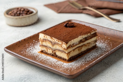 Delicious Tiramisu Served on a Brown Plate With Coffee Beans Generative AI
