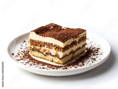 Delicious Tiramisu Slice with Cocoa Powder on White Plate Creamy Layered Dessert Concept