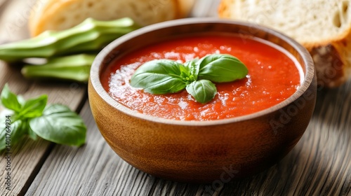 Delicious Tomato Soup in Wooden Bowl with Basil and Bread