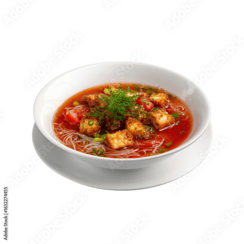 Delicious Tomato Soup with Crispy Tofu and Rice Noodles